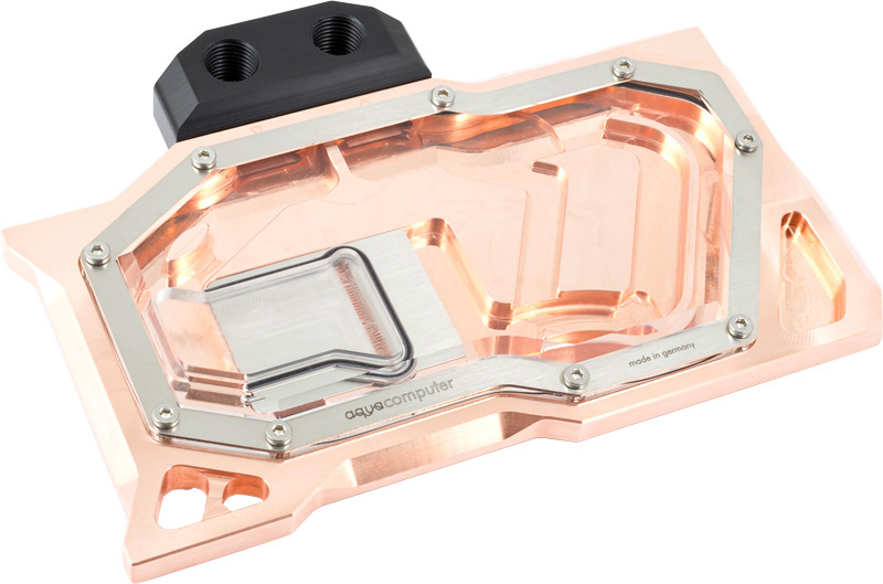 Der Boden ist aus hochwertigem Elektrolytkupfer mit einer Stärke von massiven 10mm gefertigt. Durch eine präzise Fertigung werden beim kryographics GPU und RAM direkt mit Wärmeleitpaste als Kontaktmittel gekühlt. Dies sorgt für die bestmögliche Anbindung zwischen Grafikkarte und Kühler. Für die Spannungsregler wird ein Wärmeleitpad von sehr hoher Qualität mitgeliefert. Die Karte wird mit Hilfe von Abstandshaltern aus vernickeltem Messing kinderleicht montiert.
